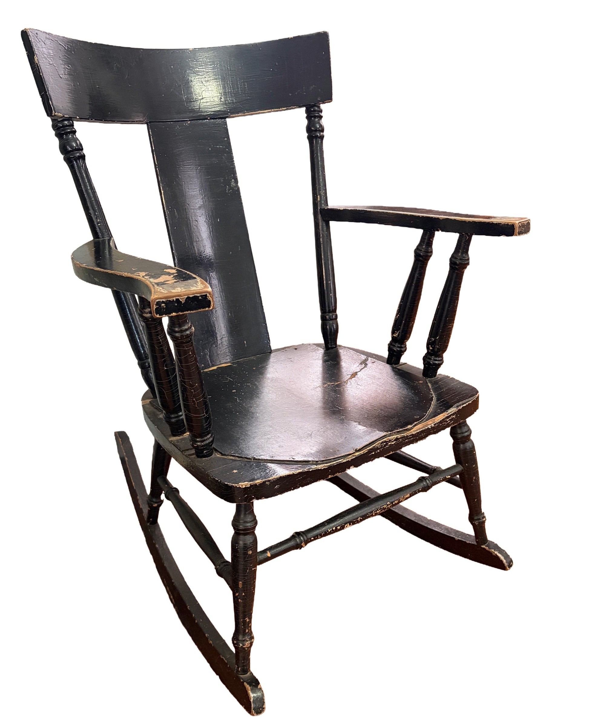 Constructed from solid hardwood and finished in a historic black paint, the chair shows the honest wear expected from over 170 years of use. Areas of paint loss and surface patina reveal the natural wood beneath and contribute to the chair’s authentic character.