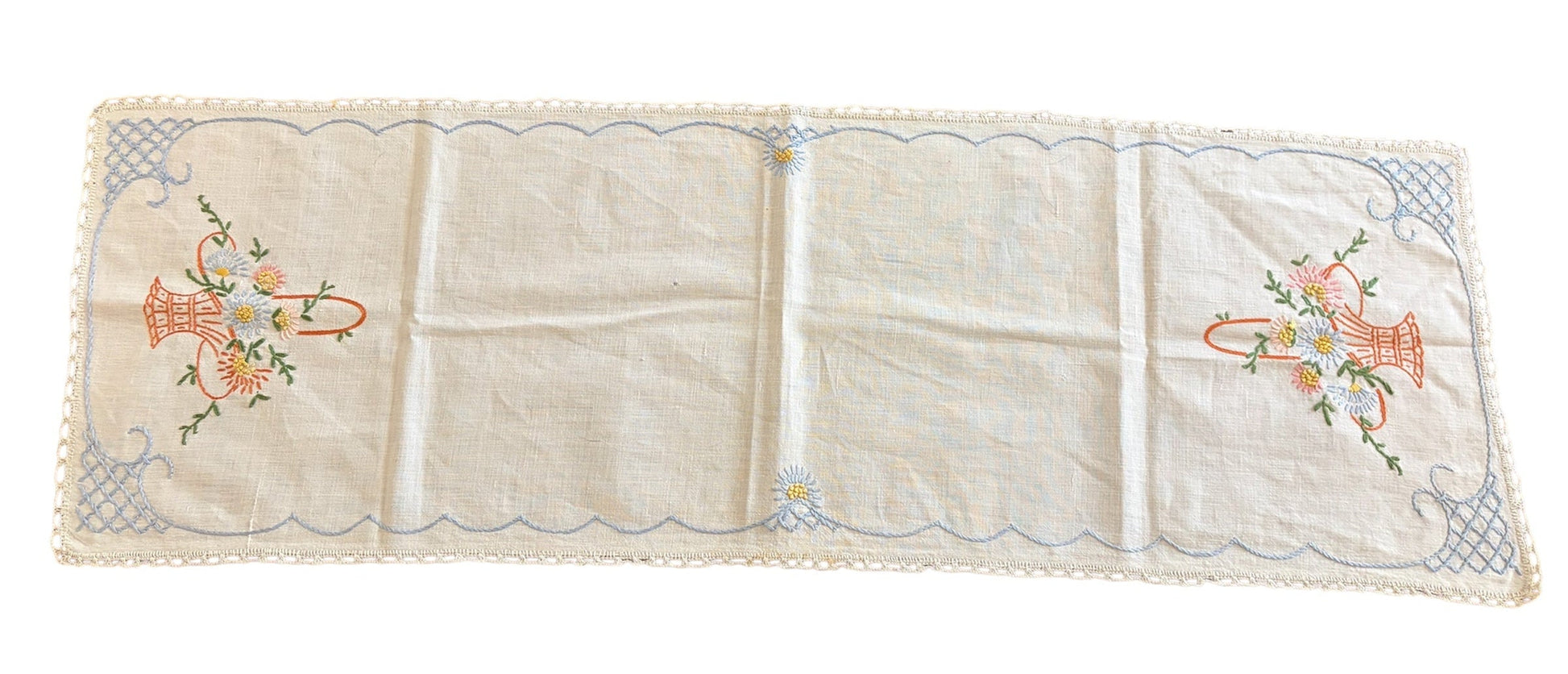 Vintage Hand-Embroidered Linen Table Runner with Floral Basket Motif and Crocheted Lace Edge, c.1930s